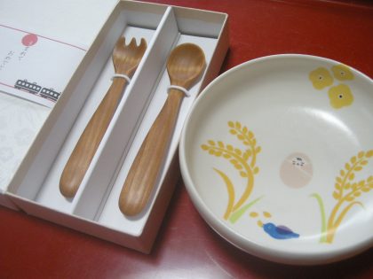 ご出産のお祝いに、こんな食器とスプーンのセットはいかがですか。