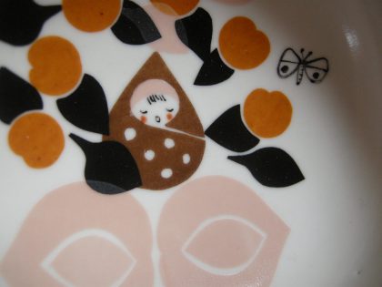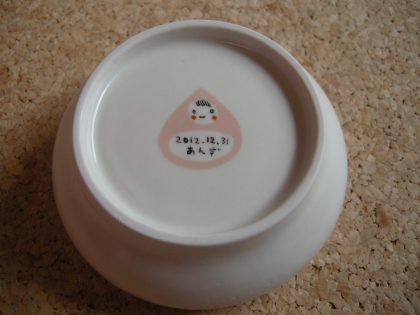 ご出産お祝いにご依頼いただいた離乳食の器(小)です。あんずちゃんという女の子、お母さんはももこさん、ということでモチーフは杏と桃になりました。